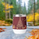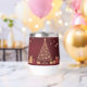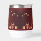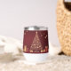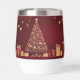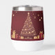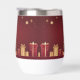 Este tumbler termal cuenta con un bello árbol de Navidad adornado con adornos dorados y luces brillantes. El árbol está rodeado por una serie de cajas de regalo, cada una envuelta con cintas y arcos, creando una atmósfera alegre y festiva