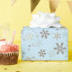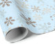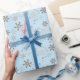 Papel de envolver de regalo de vacaciones mostrado en un color de fondo azul claro con una estampación de copos de nieve de Navidades festivos. Personalizar este artículo o compra como está. Imagen de archivo www.freepik.com