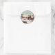Una hermosa escena de la puesta de sol de Navidades de principios del siglo XX para pegatinas de vacaciones. Un caballo tirado en trineo en la nieve frente a una iglesia del pueblo y vecinos caminando hacia un Navidad incluso masa hacen que esta escena de Navidades a la antigua moda sea tranquila y única.