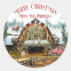 Navidades Evergreen Pegatina de la Ronda de Vacaciones de Barn. Hermoso granero histórico con vidrieras centenarias adornando el frente. Decorada para Navidades y divertida fiesta para amigos, familia y bodas de invierno. Camión de época llega con árboles y regalos para el día especial. El búfalo se para en la nieve a lo lejos. Perfecto para el regalo de sus amantes del granero favorito, para sellar un sobre o sellar una bolsa de galletas. Utilice el mensaje existente o personalice la tarjeta con su propio mensaje y el nombre de su familia o compañía. "¡Feliz Navidad!