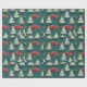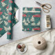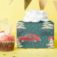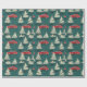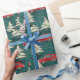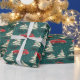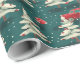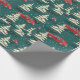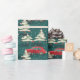 Un bonito patrón con coches rojos conduciendo entre pinos nevados, situado sobre un rico fondo verde, capturando el espíritu de la temporada de vacaciones y la alegría de regalar.
