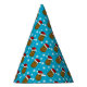 Haz que tus Navidades se diviertan con estos adorables gorras fiestas que presentan un divertido patrón de repetición de patatas de Navidades marrones con sombreros rojos de Papá Noel con estacas blancas y esponjosas pompas. Detrás hay un fondo azul con copos de nieve brillantemente blancos.