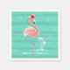Diseño inspirado a mediados del siglo XX con un flamingo rosa festivo con un sombrero de Santa Claus rojo, estrellas y palmeras decoradas con baubles colocados sobre un fondo acuático a rayas. Un diseño de personalizable para que puedas personalizar con tu propio texto, imágenes e ideas. Imagen original de arte digital creada por Quirky Moda.
