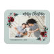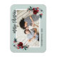 Tarjetas de fotos de vacaciones magnéticas personalizado con plantillas simples para la personalización. Este diseño festivo presenta un elegante borde floral acuático de colores rojo, verde y burdeos sobre un fondo de menta. El texto dice "Feliz Navidad" en un moderno tipo de letra de escritura caligráfica. Personalízalo con tus fotos, nombre, año u otro texto personalizado. Utilice las herramientas de diseño para editar el texto, añadir más fotos y crear uno único de los amables imanes de tarjetas de fotos de vacaciones.
