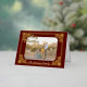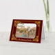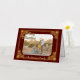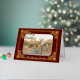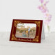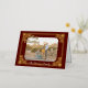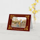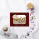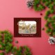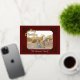 Tu foto con subtítulos con el texto de oro de Feliz Navidad y enmarcada en Relieve metalizado de oro en un fondo de Borgoña. Su apellido en la parte inferior y la dirección de retorno en la parte posterior. Foto: Photography © Storytree Studios, Stanford, CA.