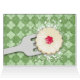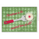 "de la cocina de" carta de Navidades culinarios con una espátula y galleta de gelatina con azúcar en polvo en un Relieve metalizado verde y deslumbrante y fondo de copos de nieve para panaderos y cocineros a los que les encanta regalar su lista con dulces dulces pasteles de vacaciones.