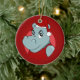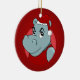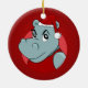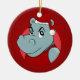 Ornamento navideño con el ilustracion de un lindo hipopótamo feliz con un gorra de Santa Claus rojo y blanco; diseño de vacaciones para Navidades para niños, en un fondo rojo
