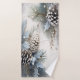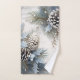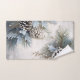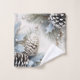 Unas preciosas toallas de Navidad con un agradable fondo azul claro/gris, caída de la nieve, ramas de pino y conos de pino.