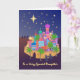 Una tarjeta de Navidades alegres para una Hija muy especial, con un cielo estrellado, los tres sabios a lo lejos en sus camellos, y José, María y un burro abriéndose paso por la pequeña ciudad de Belén, de colores vivos. Las letras, las Navidades Joy y las estrellas están pintadas con efecto oro (no con Relieve metalizado dorado). Diseño de medios mixtos de Judy Adamson.