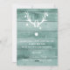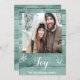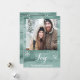 Delante: Una pared rústica de madera verde como fondo. Con copas de nieve blancas, follaje y bayas como decoración. Con una plantilla para la foto de su familia y el nombre de su familia. Con el texto: Alegría escrita con una escritura de estilo con letras a mano. Letras blancas. Parte posterior: la pared de madera y una imagen moderna, divertida y abstracta de un reno en blanco. Plantillas para sus deseos de vacaciones, saludos y los nombres de los miembros de la familia.