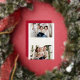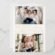 Moderna tarjeta de fotos de Navidad con "Feliz Navidad" en el centro de la tarjeta con letras de moda de Relieve metalizado dorado con fondo blanco. Dos de tus fotos horizontales favoritas se muestran en la parte superior e inferior del diseño enmarcado por un borde de Relieve metalizado dorado. Personalice la tarjeta de Navidades de fotos con su apellido. La tarjeta de Relieve metalizado se invierte para mostrar un fondo rojo con puntos blancos sutiles (nieve).