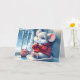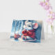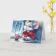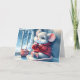Un ratón lindo con un suéter rojo acogedor se sienta junto a una ventana con nieve cayendo fuera de Texto se puede cambiar.