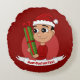 Una almohada redonda con el ilustracion de un niño pequeño y feliz, lindo y sonriente, lleva el traje rojo y blanco de Santa Claus y tiene un regalo; con una plantilla de texto editable para tu nombre o mensaje, Navidades diseño de vacaciones con fondo rojo