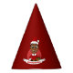 Fiesta gorra con el ilustracion de un lindo sonriente y feliz muchacho, lleva disfraz rojo y blanco de Santa Claus y tiene un regalo; con plantilla de texto editable para tu nombre o mensaje, Navidades diseño de vacaciones con fondo rojo