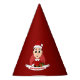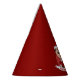 gorra fiesta con el ilustracion de un lindo sonriente y feliz muchacho de cabello negro, lleva disfraz rojo y blanco de Santa Claus y tiene un regalo; con plantilla de texto editable para tu nombre o mensaje, diseño de vacaciones Navidades con fondo rojo