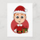 Diseño con ilustracion de un lindo sonriente chico feliz con el pelo jengibre, el muchacho está usando un disfraz de Santa Cláusula con gorra rojo y sosteniendo un regalo; en círculo rojo sobre fondo blanco