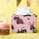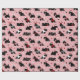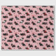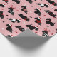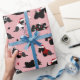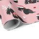 Perros escoceses adornados con trajes festivos, sombreros de Papá Noel y suéteres de argyle con adornos navideños dispersos en un fondo rosado.