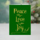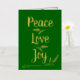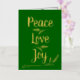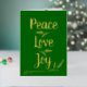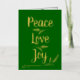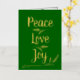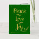 "Paz, amor, alegría" Navidades Relieve metalizado tarjeta de vacaciones. Esta tarjeta de Navidades irradia calidez y alegría con su elegante diseño, con las palabras "Paz, Amor y Alegría" bellamente representadas en Relieve metalizado dorado en la portada. Las letras doradas brillantes se complementan con delicados adornos de pinares que evocan la belleza natural y la tranquilidad de la temporada de vacaciones. En su interior, el mensaje, "Enviándote paz, amor y alegría a estos Navidades y siempre", extiende un sincero deseo de que el destinatario lleve consigo el espíritu de la temporada durante todo el año. Esta tarjeta es una expresión atemporal del amor y la conexión que hacen a los Navidades tan especiales.