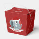 Navidades rojos caja de favores con un ilustracion de un lindo elefante con tapa roja de Santa; gran decoración para vacaciones de Navidades, diseño de plantillas editable con campo personalizado para tu propio texto, ilustrado por Radka Kavalcova