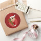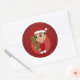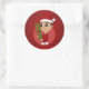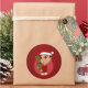 Diseño con el ilustracion de un lindo sonriente niño pequeño y feliz, lleva el traje rojo y blanco de Santa Claus y tiene un regalo ; Navidades diseño de vacaciones con fondo rojo