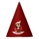 Fiesta gorra con un ilustracion de un lindo sonriente chica feliz con el pelo largo negro, lleva disfraz rojo y blanco de Santa Claus y tiene un regalo; con plantilla de texto editable para tu nombre o mensaje, diseño de vacaciones Navidades con fondo rojo