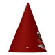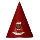gorra fiesta con un ilustracion de una linda sonriente feliz chica negra de pelo corto, lleva disfraz rojo y blanco de Santa Claus y tiene un regalo; diseño de vacaciones para Navidades con antecedentes rojos