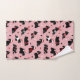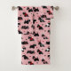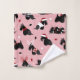 Perros escoceses adornados con trajes festivos, sombreros de Papá Noel y suéteres de argyle con adornos navideños dispersos en un fondo rosado.