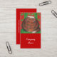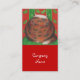 Un feliz gato de los tortoiscones (¡que se parece a un pudín de navidades!) se sienta en un cojín verde contra un fondo rojo y verde con motivos en hojas huecas. Plantilla de tarjeta de visita con un personalizable para personalizar con su propio texto, mensaje o imágenes. Imagen creada a partir de un dibujo de lápiz de color original.