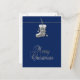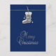 Navidades colgantes de plata llenando de saludos con fondo azul.