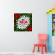 poster de navidades con ramas, decoración y marco de poinsettia. Feliz Navidad y Feliz Año Nuevo en un fondo de madera.