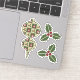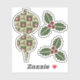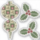 Cuatro plazas de color verde y marrón están adornadas con adornos rojos adornados con copos de nieve blancos y verde y con bayas rojas. El punzonado blanco aporta un toque decorativo, dando a la tónica repetida la apariencia de una colcha, creando un ambiente muy acogedor para las vacaciones de los Navidades. La forma de un ornamento de lágrima crea una máscara para que el diseño añada un toque estacional final.