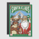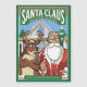 El diseño de este Navidad parece un viejo playbill o un poster de cine que dice "Santa Claus y el reno que patea". Este diseño retro de Navidades tiene un fondo que incluye una iglesia, un árbol de Navidad con nieve, y copos de nieve cayendo.