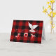 Paloma blanca con signo de alegría en una cuerda rayada roja y blanca con copos de nieve sobre manto de búfalo rojo y negro para Navidades