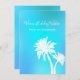Tarjetas de Navidad planas en tonos azul acuático tropical con palmeras de silueta blanca y redacción. Personalizar un saludo y añada una firma a las tarjetas vacacionales simples y únicas con un tema tropical. Revertir es azul.