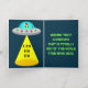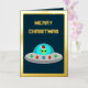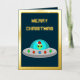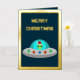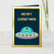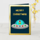 Esta impresionante tarjeta de Navidades de Relieve metalizado presenta una imagen de arte digital de una nave espacial alienígena decorada con luces de Navidades de colores brillantes. Dentro del OVNI que mira por la ventana hay un extraterrestre verde con los ojos negros usando un sombrero festivo de Santa. Saludos de vacaciones desde el espacio exterior para todos los terrícolas. Hay un texto personalizado dentro para que puedas personalizar esta tarjeta. El texto personalizado en el frente está en un hermoso Relieve metalizado de oro.
