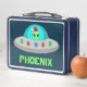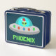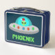 Esta impresionante lonchera de Navidades presenta una imagen de arte digital de una nave espacial alienígena decorada con luces de Navidades de colores brillantes. Dentro del OVNI que mira por la ventana hay un extraterrestre verde con los ojos negros usando un sombrero festivo de Santa. Saludos de vacaciones desde el espacio exterior para todos los terrícolas. Hay texto personalizado para que pueda personalizar este diseño con un nombre.
