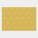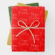 Un trío de sábanas de papel de envolvimiento para fiestas de feliz cumpleaños, que incluyen una hoja de papel de envoltura de feliz cumpleaños, una hoja de papel de envoltura de oro y una hoja de papel de envoltura de feliz cumpleaños verde.