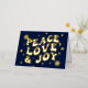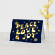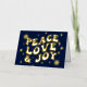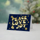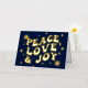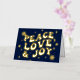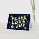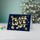 A stylish twist on retro cheer — this navy blue Peace Love Joy card features groovy 70s lettering with modern sophistication. Ideal for sending timeless festive greetings with a bold vintage flair.