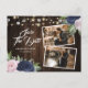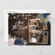 Rústica floral salva las postales de fecha con una madera rústica adornada con rosas azules, ruidosas y rosas, encaje floral blanco y luces de cuerda. Diseño de tarjeta ideal para una fiesta de boda rústica de color azul marino y lujuriante. Elementos coincidentes disponibles.
