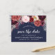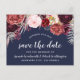 Navy Fall Marsala Rubor Peony Save The Date Cards - presenta un fondo azul marino con varias peonías, rosas y otros elementos florales en tonos de Marsala, burdeos, rosa azul, gris y más. Vea la colección coincidente de esta página para completar la búsqueda del evento.