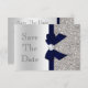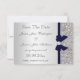 Tarjetas personalizadas de "Save The Date" para boda. Elegantes tarjetas planas de "save the date" a doble cara con colores personalizados plateado y azul marino con un hermoso patrón brillante de lentejuelas impresas, lazos y cintas de imagen vectorial azul marino brillantes impresos y diamantes de imagen impresa elegantes y con estilo, joyas con brillo y texto gris plateado oscuro en un fondo degradado plateado. Estas elegantes y glamurosas tarjetas formales planas de plata están decoradas en ambos lados e impresas en el papel de invitación de su elección. Tarjetas hermosas, chic, modernas y a doble cara con brillo y glamour femeninos. Tenga en cuenta: todas las invitaciones en Zazzle tienen imágenes impresas planas. Tengo productos a juego para bodas en mi tienda. El texto, la fuente y los colores de la fuente son personalizables para satisfacer sus necesidades. Si necesita ayuda para personalizar su producto, por favor contácteme a través de mi tienda.
