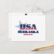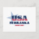Postal de Nebraska. Un diseño tipográfico creativo que encapsula la esencia de Nebraska con colores rojo, blanco y azul audaces y elementos patrióticos, incluidas estrellas y rayas.