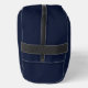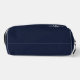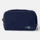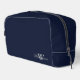 Este bolso de kit de dopp presenta un apellido guionado por un guión gris oscuro sobre un monograma gris claro en la esquina inferior derecha sobre un fondo azul oscuro profundo.