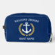 Un bolso personalizado de temática náutica, cosmética, aseo y neceser de aseo para que los objetos de viaje estén organizados y sean seguros. Este diseño presenta un ancla de barco hecho en personalizado con hojas de laurel de color oro y una estrella dorada con un texto rico que dice "Welcome Aboard" (Bienvenido a bordo) y tu nombre o nombre del barco. Los colores son blanco y dorado en azul marino regal o edita el diseño y cambia fácilmente el kit a cualquier color deseado. Hace un gran regalo.