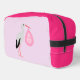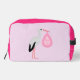 Esta impresionante bolsa de cosmética presenta una imagen gráfica de una cigüeña blanca adorable con plumas de cola negra sujetándose a un paquete de mantas rosa pálido. Hay un texto rosa en el paquete que dice "Niña bebé". Este diseño es perfecto para celebrar a una niña.