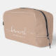 Esta bolsa de accesorios de la dama de honor presenta una tipografía manuscrita de escritura blanca con toques en un fondo de bronceado. Presenta a las damas de honor un neceser para su maquillaje y objetos pequeños presentados tradicionalmente en la cena de ensayo, para su uso temprano por la mañana antes del boda.