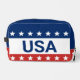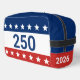 Celebrating the USA's 250th anniversary. Front: This red, white, and blue dopp kit has the word 'USA' in the center. The years 1776 and 2026 are on the sides. The top stripe is blue and has white stars. The center stripe is white. The bottom stripe is red with white stars. Back: 250