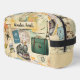Este Dopp Kit presenta un collage de elementos de viaje de estilo vintage. Esto sería un buen regalo para alguien que ama viajar o como un buen regalo de viaje. El texto del Kit de dopp es personalizable con tu propio texto o se puede dejar tal cual.