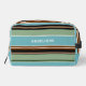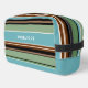 El diseño de esta bolsa de artículos de aseo presenta un impresionante diseño de estampado de arte de rayas horizontales de color azul verde azulado, verde sabio, marrón oscuro y medio y marfil color crema sobre un fondo negro. La variedad de esta combinación de colores crea un efecto dinámico y rítmico. La decoración es a la vez elegante y ornamentada, con un toque de honestidad y un toque de hipster. También hay espacio para el personalizar o la personalización con un monograma o una inicial de su elección. Ya sea buscando una moda y un estilo moderno o una vitalidad vintage y retro, este patrón se adaptará a su gusto y personalidad.