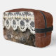 Deliciosamente rústico, gran bolsa de artículos de aseo de estilo occidental, también conocida como Dopp Kit, tiene un fondo de cuero oscuro con las herramientas y un falso panel de encaje antiguo con una hilera de perlas aplicadas. Personalízalo con la plantilla fácil de usar que se proporciona. El tipo de letra es completamente personalizable si desea utilizar una cara de tipo de estilo diferente.